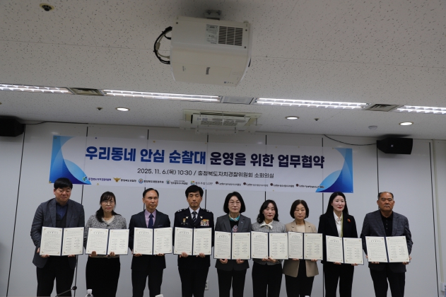[메이저뉴스]충북자치경찰위원회는 지난 6일, 충청북도경찰청, 충청북도재향경우회, 청주권 6개 시니어클럽과‘우리동네 안심 순찰대’운영을 위한 업무협약을 체결했다.