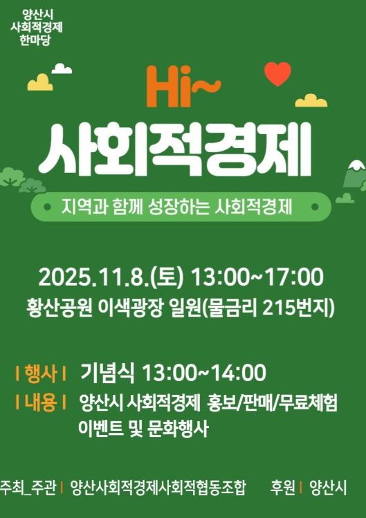 [메이저뉴스]양산시는 오는 8일 오후 1시부터 오후 5시까지 황산공원 이색광장 일원에서 2025년 사회적경제 한마당(부제‘Hi~ 사회적경제’) 행사를 개최한다.