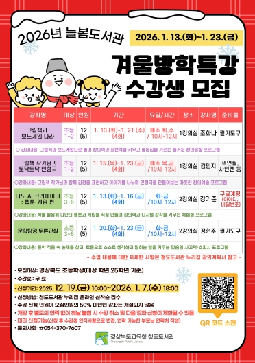 [메이저뉴스]경상북도교육청 청도도서관(관장 조은희)은 겨울방학을 맞아 어린이들의 창의력과 사고력을 키울 수 있는 '2026년 늘봄도서관 겨울방학특강' 수강생을 오는 12월 19일부터 모집한다.