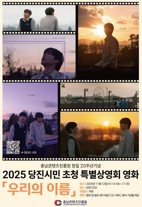 상영작은 진흥원의 ‘당진 로케이션 인센티브 지원사업’을 통해 제작된 한국영상대학교 학사 장편영화 '우리의 이름'으로, 합덕읍, 송산면, 우강면 등 당진 곳곳의 일상적 풍경을 스크린에 담았다.