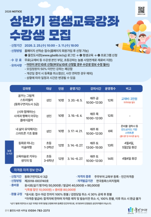 [메이저뉴스]경상북도교육청 울진도서관은 오는 3월부터 6월까지 ‘상반기 평생교육강좌 및 늘봄도서관’을 운영한다.