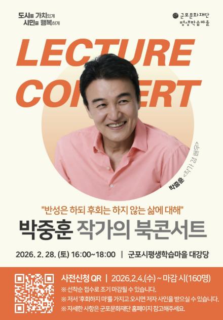 [메이저뉴스]군포문화재단 군포시평생학습마을은 2월 28일 렉처콘서트의 일환으로 북콘서트를 개최한다. 올해 3회를 맞이하는 렉처콘서트는 시민이 참여하여 즐길 수 있는 평생학습 대표 행사로서 자리매김하고 있다.