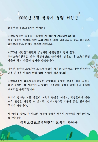 [메이저뉴스]김포교육지원청은 2026년 3월 신학기를 맞아 관내 학교를 대상으로 ‘교육장 청렴 서한문’을 발송했다고 밝혔다.