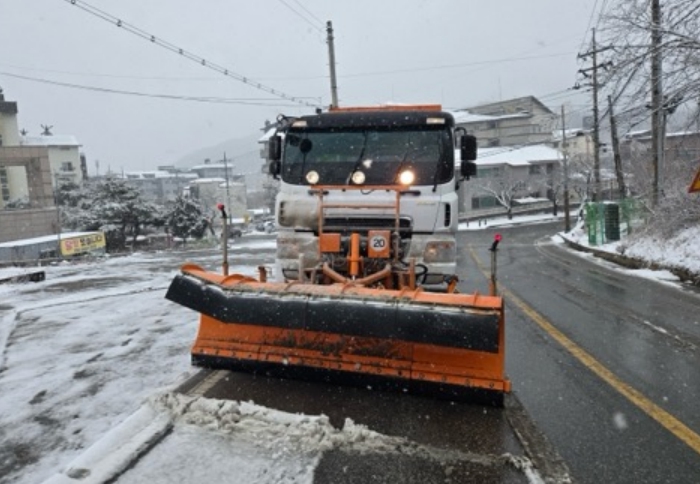 시는 이날 오전 11시 10분을 기해 비상근무 1단계를 발령하고, 15톤 제설차량 33대와 도로과 기동반, 제설차량 3대를 투입해 급경사지 및 취약 구간 중심으로 제설작업을 실시하고 있다.