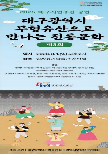 [메이저뉴스] 대구문화예술진흥원 박물관운영본부 소속 대구방짜유기박물관에서는 2026년 대구시민주간(2.21.~28.)을 맞아 3월 1일 오후 2시, 박물관 재현실에서 대구의 전통문화를 알리는 특별 공연 ‘대구광역시 무형유산으로 만나는 전통문화’를 개최한다.
