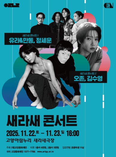 [메이저뉴스](재)고양문화재단은 소극장 기획공연 시리즈 ‘2025 새라새 ON 시리즈’의 11월 프로그램으로, 감각적인 싱어송라이터들을 만날 수 있는 '새라새 콘서트 1~2'를 11월 22일과 23일 양일간 고양아람누리 새라새극장에서 개최한다.