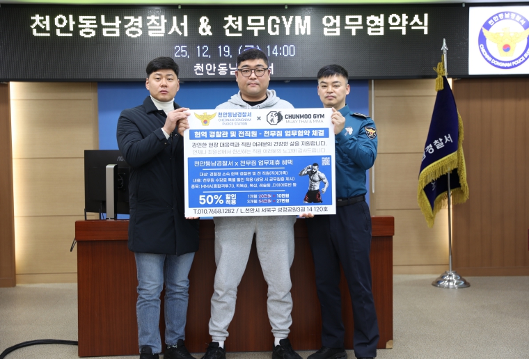 [메이저뉴스]천안 동남경찰서(서장 송해영)는 2025년 12월 19일(금) 오후 2시, 천안동남경찰서 중회의실에서 무에타이·MMA 전문 체육관인 ‘천무짐’(관장 문보람)과 ‘경찰관 체력 증진 및 복지 향상’을 위한 업무협약(MOU)을 체결했다고 밝혔다.