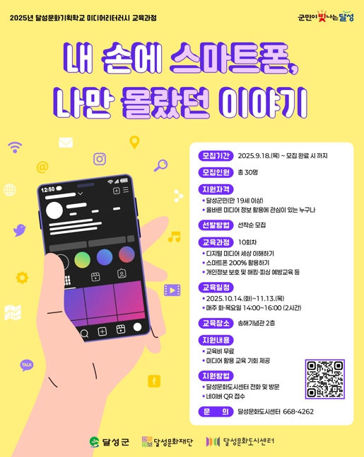 [메이저뉴스](재)달성문화재단 달성문화도시센터는 10월 14일부터 11월 13일까지 선비체험관(송해기념관) 2층에서 ‘미디어리터러시 교육과정 – 내 손에 스마트폰, 나만 몰랐던 이야기’를 진행한다.