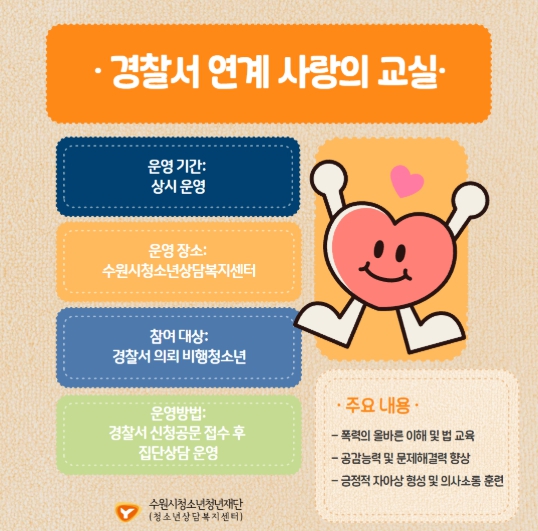 [메이저뉴스]수원시청소년청년재단 수원시청소년상담복지센터는 수원영통경찰서와 수원팔달경찰서에서 의뢰된 비행청소년을 대상으로 ‘사랑의 교실’프로그램을 연중 운영하고 있다.