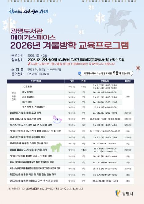 | ▲ 광명도서관 메이커스페이스 '2026년 겨울방학 교육프로그램' 안내문. |