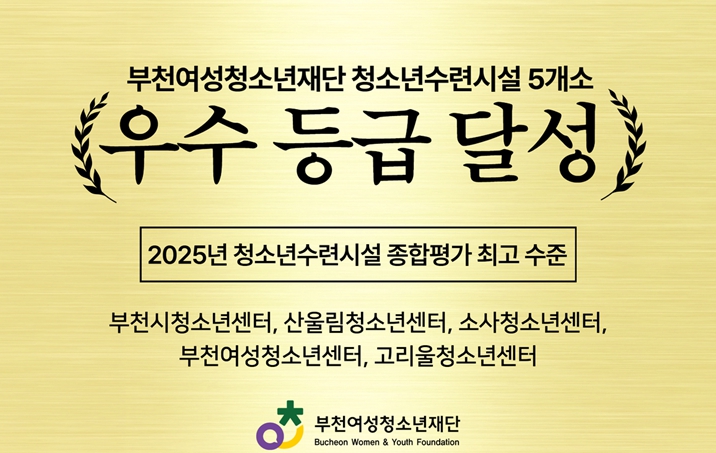 [메이저뉴스]부천여성청소년재단이 청소년수련시설 5개소(부천시청소년센터, 산울림청소년센터, 소사청소년센터, 부천여성청소년센터, 고리울청소년센터)가 성평등가족부 주관 2025년 청소년수련시설 종합평가에서 5개 시설 모두 최고 수준인 ‘우수’ 등급을 달성하는 쾌거를 이루었다.