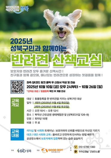 교육은 두 차례 열린다. 11월 4일 화요일과 8일 토요일 오전 10시부터 12시까지 북악산 근린공원 생태체험관(성북로31길 126-9)에서 진행되며, 동물등록을 마친 반려견을 키우는 성북구민이라면 누구나 신청할 수 있다.