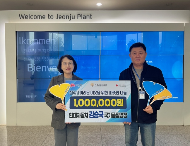[메이저뉴스]현대자동차 전주공장 김승국 국가품질명장은 16일 전주시복지재단에 어려운 이웃을 위한 성금 100만 원을 기탁했다.