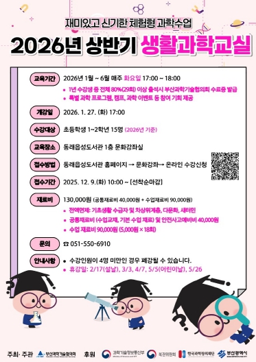 [메이저뉴스]부산 동래구는 2026년 1월부터 동래읍성도서관과 안락누리도서관, 온빛어린이 작은도서관에서 부산과학기술협의회와 연계해 관내 초등학생을 대상으로 ‘생활과학교실'을 운영한다고 밝혔다.