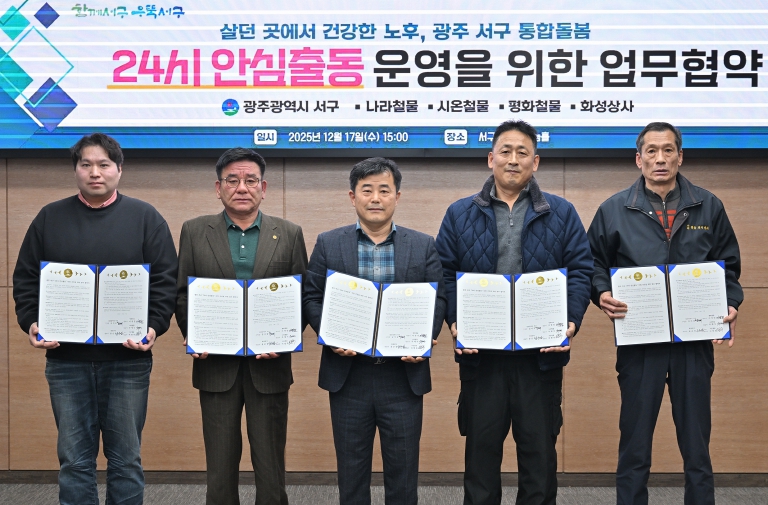 [메이저뉴스]광주광역시 서구가 주민 일상 속 불편을 신속하게 해소하기 위해 팔을 걷어붙였다. 서구는 17일 서구청 나눔홀에서 관내 착한가게 4곳과 함께 ‘24시 안심출동’ 사업의 안정적 운영을 위한 업무협약을 맺고 빈틈없는 돌봄 서비스 제공에 협력하기로 했다. 이날 협약식에는 김성배 부구청장을 비롯해 윤순섭 화성상사 대표, 이영일 평화철물 대표, 주재식 나라철물 대표, 이영주 시온철물 대표가 참석했다. 이 업체들은 매월 정기 기부로 나눔을 실천하는 ‘착한가게’로 이웃돌봄 역할에도 적극적으로 참여하고 싶다는 뜻을 밝혔다.