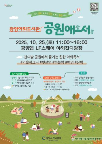 [메이저뉴스]광양시는 오는 10월 25일 광양읍 LF스퀘어 잔디밭공원에서 자연과 책이 어우러진 『광양 야외도서관–공원애愛서書』 행사를 연다고 밝혔다.