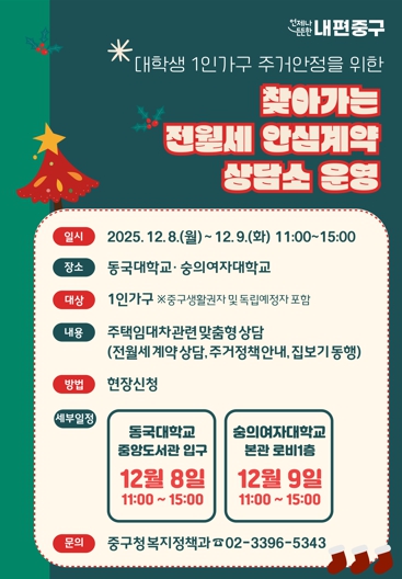 [메이저뉴스]서울 중구가 12월 8일과 9일에 동국대학교와 숭의여자대학교에서 대학생 1인 가구의 전월세 계약에 대한 불안과 부담을 덜어줄‘찾아가는 전월세 안심계약 상담소’를 운영한다. 지난 6월에 이은 두 번째 방문이다.