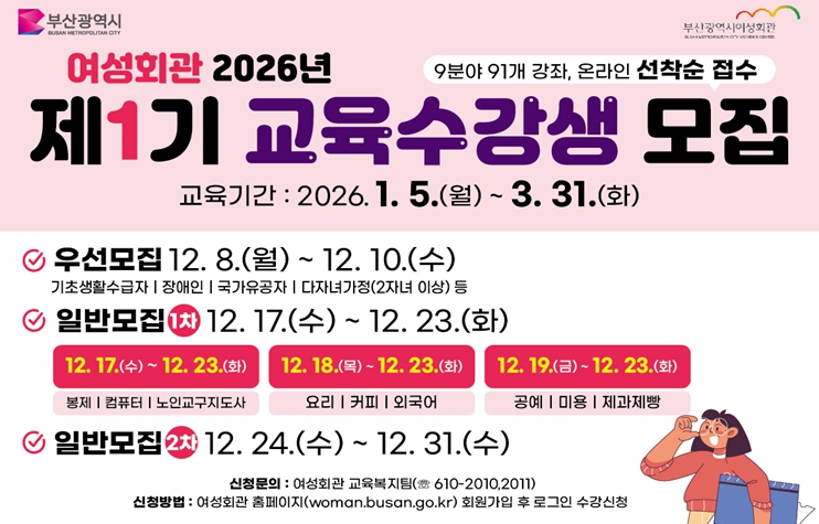 [메이저뉴스]부산시 여성회관은 내일(8일)부터 '2026년 제1기 교육과정' 수강생을 모집한다고 밝혔다.