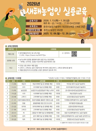 [메이저뉴스]춘천시가 내년 농업 현장에서 필요한 신기술을 집중 교육하는 2026년 새해농업인실용교육을 운영한다.