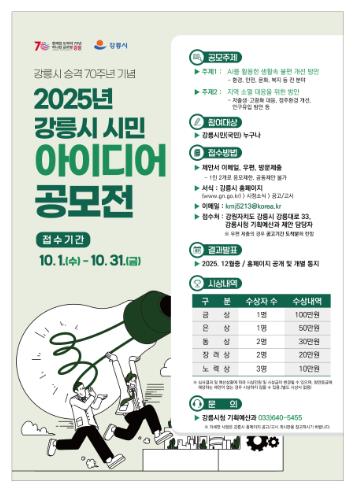 [메이저뉴스]강릉시는 강릉시 승격 70주년을 맞아 시민의 창의적이고 혁신적인 의견을 시정에 반영하기 위해 ‘2025년 강릉시 시민 아이디어 공모전’을 10월 1일부터 10월 31일까지 31일간 개최한다.
