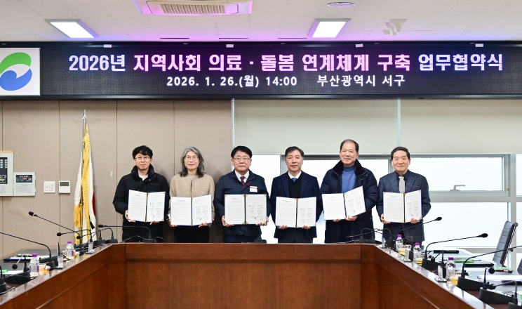 [메이저뉴스]부산 서구는 지난 26일 ‘돌봄통합지원법’ 시행에 맞춰, 의료·요양·돌봄 통합지원기반을 조성하고자 ∆동아대학교대신병원(병원장 김기림), ∆바른병원(병원장 강정한), ∆선하요양병원(이사장 허방), ∆송도요양병원(이사장 정하용), ∆이의용밝은길요양병원(병원장 이의용)과 업무협약(MOU)을 체결했다.