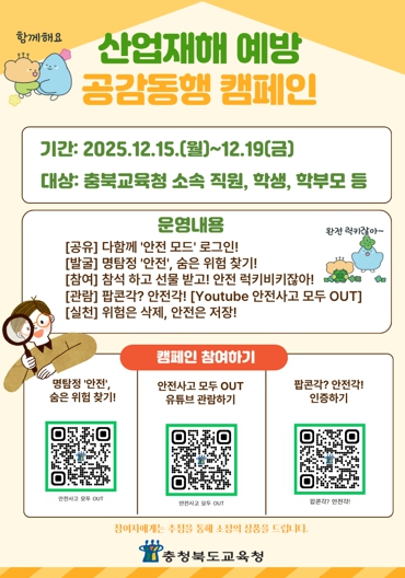 하재숙 노사정책과장은 “이번 캠페인을 통해 교육가족이 함께 숨은 위험을 찾고 개선하는 과정이 곧 서로의 안전을 지켜주는 따뜻한 공감동행의 실천이 되길 기대한다.”라며, “앞으로도 현장의 목소리에 더욱 세심하게 귀 기울여, 누구나 아침에 눈을 뜨면 출근하고 싶은 행복하고 안전한 일터를 만들기 위해 노력하겠다.”라고 밝혔다.