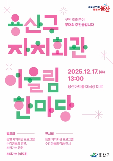 [메이저뉴스]서울 용산구가 17일 용산아트홀 대극장 미르에서 한 해 동안의 자치회관 운영 성과를 공유하고 주민 화합을 도모하는 ‘2025년 자치회관 어울림한마당’을 개최한다.