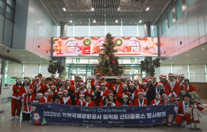 | ▲ 25일 진행된 ‘2025 인천공항 임직원가족 산타클로스 봉사활동’에서 인천국제공항공사 임직원가족 산타클로스 봉사단이 기념촬영을 하고 있다. |