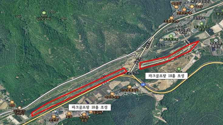 | ▲ 경주시 보문동 동궁원 인근 북군동 일원에 조성될 예정인 파크골프장 위치도. 경주시는 이 일대 하천부지에 36홀 규모의 파크골프장을 단계적으로 조성할 계획이다. |