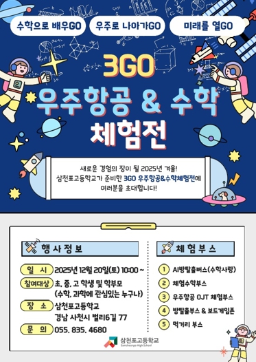 [메이저뉴스]삼천포고등학교는 오는 12월 20일 오전 10시부터 교내에서 ‘3GO 우주항공&수학 체험전’을 개최한다.