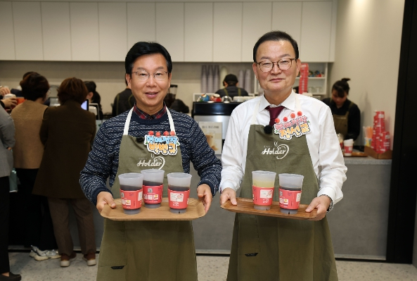 [메이저뉴스]박병규 광산구청장과 정선교 대명외식산업 대표가 27일 광산구청 1층 모두의 쉼터 조성을 기념해 청각장애인의 자립을 돕는 일터인 구청 내 ‘카페홀더’에서 일일 명예점장 사회공헌활동을 진행했다.
