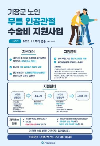 [메이저뉴스]기장군은 오는 2026년부터 부산시 최초로 ‘어르신 무릎인공관절 수술비 지원사업’을 확대 시행한다고 23일 밝혔다.