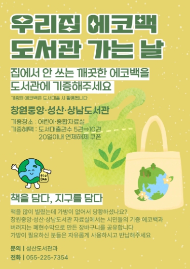 이번 서비스는 도서관에 방문하여 갑자기 많은 책을 빌리거나 가방을 준비하지 못한 시민들에게 편의를 제공하고, 시민들이 기증한 에코백과 폐현수막을 재활용한 장바구니를 공유하여 일상 속 친환경 나눔 문화를 확산시키기 위해 마련됐다.