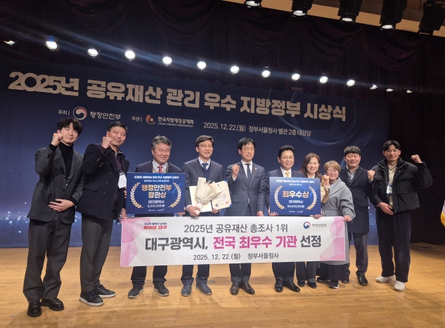 [메이저뉴스]대구광역시는 12월 22일 행정안전부 주최 ‘2025년 공유재산 우수 지방자치단체 시상식’에서 공유재산 총조사 부문 최우수 기관 선정과 더불어, 공유재산 우수사례 경진대회에서 우수상(장관상)을 수상하는 등 공유재산 관리와 활용 분야에서 최고 수준의 역량을 입증했다.