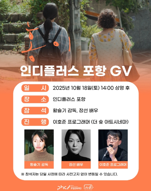 [메이저뉴스] 포항문화재단이 운영하는 독립영화전용관 인디플러스 포항은 오는 18일 오후 2시, 영화 ‘홍이’ 상영 후 감독과 배우가 직접 참여하는 GV(관객과의 대화)를 개최한다고 밝혔다.
