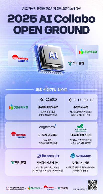 [메이저뉴스]제주창조경제혁신센터(대표이사 이병선, 이하 제주센터)는 DB손해보험, 조광페인트, 하나은행과 함께 추진하는 특화산업 오픈이노베이션 ‘2025 AI 콜라보 오픈그라운드 프로그램’을 통해 최종 6개 스타트업을 선정하고, 기술 테스트와 솔루션 개발을 통해 실질적인 사업화 협력에 나선다.