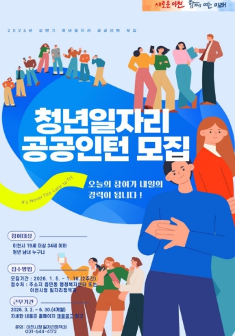 [메이저뉴스]이천시는 2026년 1월 5일부터 1월 16일까지 ‘청년일자리 공공인턴사업’의 상반기 참여자 47명을 모집한다.