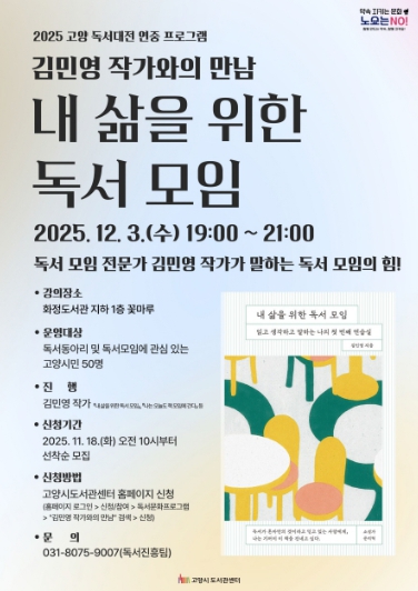 [메이저뉴스]고양특례시는 오는 12월 3일 오후 7시, 화정도서관 지하 1층 꽃마루에서 독서모임 분야 전문가인 김민영 작가를 초청해 ‘김민영 작가와의 만남: 내 삶을 위한 독서 모임’프로그램을 운영한다고 밝혔다.