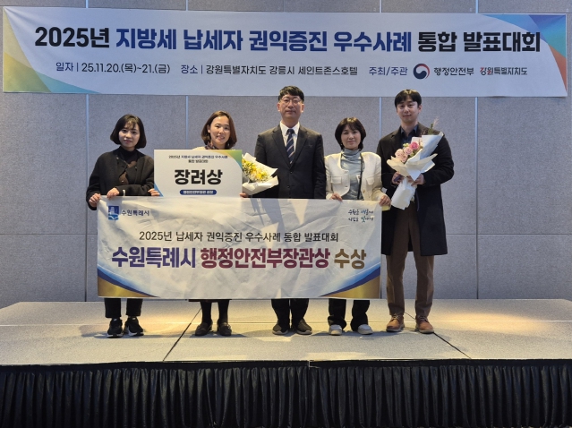 [메이저뉴스] 수원특례시가 행정안전부 주관으로 20~21일 강릉시 세인트존스호텔에서 열린 ‘2025년 납세자 권익 증진 우수사례 통합 발표대회’에서 장려상을 받았다.
