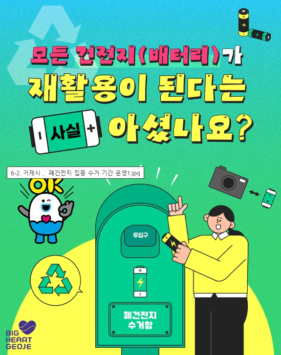 또한 거제시는 폐건전지 집중 수거뿐만 아니라 재활용 가능자원(종이팩, 폐건전지, 투명페트병)을 모아오면 종량제봉투로 교환해주는 재활용품 교환사업도 추진하고 있어, 고품질 재활용품의 재활용률을 높이는데 기여하고 있다.