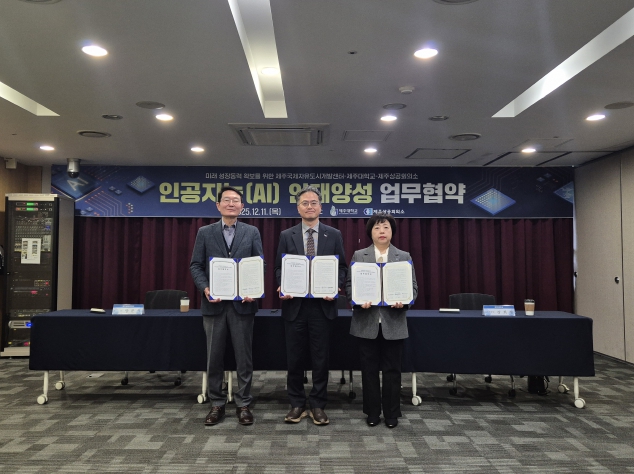 [메이저뉴스] 제주국제자유도시개발센터는 12월 11일 제주대학교, 제주상공회의소와 함께 도내 인공지능(AI) 전문인재 양성을 위한 업무협약을 체결했다.