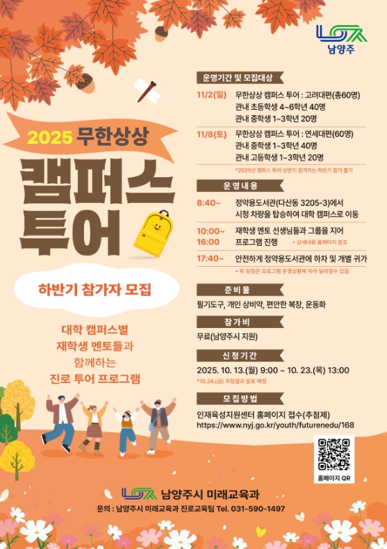 [메이저뉴스]남양주시는 10월 13일부터 10월 23일까지 관내 초등학교 4학년부터 고등학교 3학년을 대상으로 ‘무한상상 캠퍼스 투어’ 참가자를 모집한다.