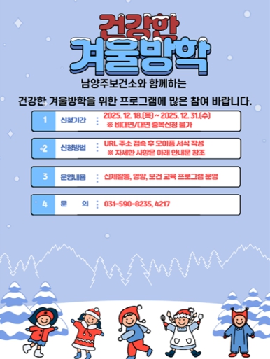[메이저뉴스]남양주보건소는 겨울방학 동안 관내 초등학생들을 대상으로‘초등학생이 건강한 겨울방학’프로그램을 이달 9일부터 내달 6일까지 4주간 운영한다고 7일 밝혔다.