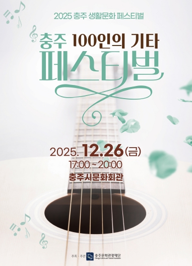 [메이저뉴스](재)충주문화관광재단은 오는 12월 26일 충주시문화회관에서‘충주 100인의 기타 페스티벌’을 개최한다고 밝혔다. 이번 페스티벌은 충주 지역의 기타동아리들이 한자리에 모여 기타의 아름다운 선율을 시민들에게 선보이는 자리로, 통기타와 클래식기타를 모두 아우르는 공연 구성이 특징이다.