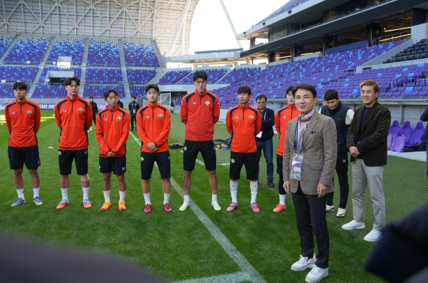 [메이저뉴스] 김진태 강원특별자치도지사(구단주)는 11월 3일 오후 3시, 일본 히로시마 에디온 피스 윙 스타디움을 방문해 아시아챔피언스리그 조별리그 원정경기를 앞두고 훈련 중인 강원FC 선수단을 격려하고 응원의 메시지를 전했다.