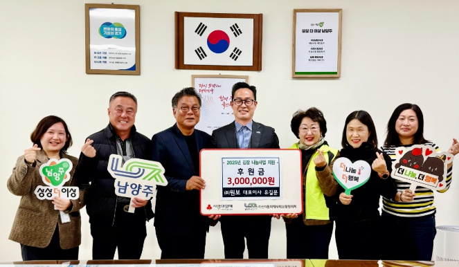 [메이저뉴스]남양주시는 29일 ㈜원보(대표이사 유길문)가 다산1동 지역사회보장협의체(위원장 정순옥)에 김장 나눔 사업비로 300만 원을 지정기탁했다고 밝혔다.