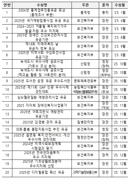 수상 내역을 살펴보면 분야별 ▲ 보건․의료 9건, ▲ 사회복지 5건, ▲ 일반행정 3건, ▲ 환경 2건, ▲ 농업 1건으로, 주민의 삶의 질과 직결되는 보건 복지 분야에서 특히 두드러진 성과를 보였다.