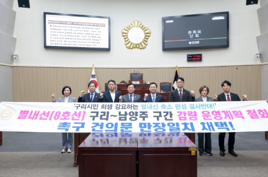 이에 구리시의회는 구리, 남양주와의 합의 및 공론화 절차 없이 추진한 일방적 행정을 규탄하며 ▲별내선 구리-남양주 구간에 대한 열차 감량 운행계획 즉각 철회 ▲출퇴근 시간대 배차 간격 현행 유지 및 시민 불편 최소화를 위한 실질적인 대안 마련 ▲향후 광역철도 운행과 관련한 중대한 변경 사항에 대해 비용 분담 지방자치단체와의 사전 합의 및 공론화 절차 이행 ▲국토교통부에 대해 교통 편익과 광역교통의 공공성을 최우선으로 고려하여 철도안전관리체계 심의의 즉각 중단 및 엄정한 지도·감독 요구를 내용으로 한 결의안을 만장일치로 채택했다.
